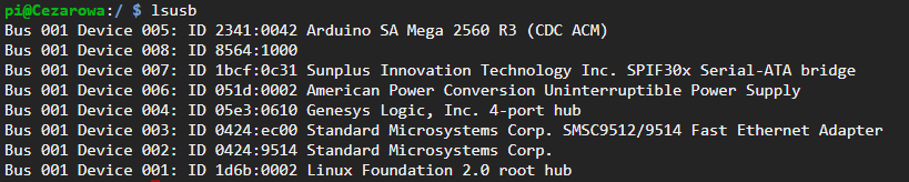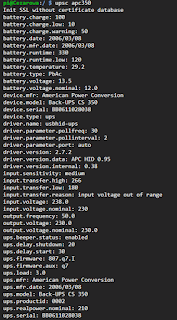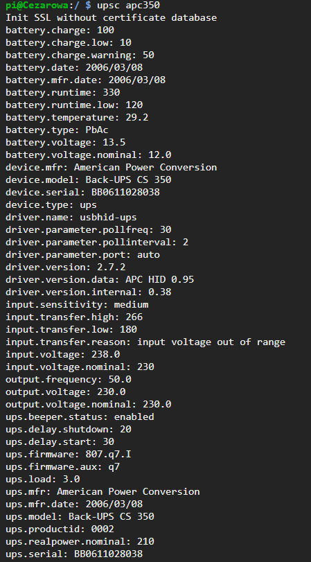Komenda jak poniżej (UWAGA, używamy nazwy, którą zdefiniowaliśmy w konfiguracji!) poda nam parametry i status UPSa.