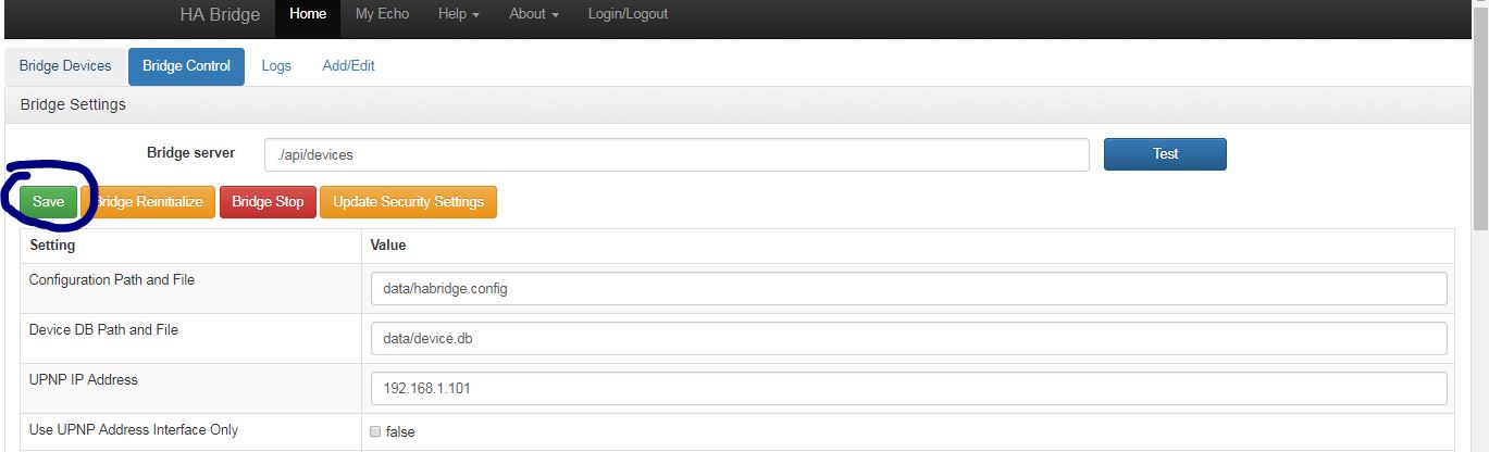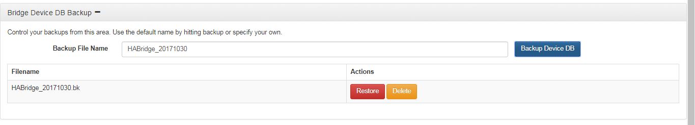Warto również od razu zrobić backup bazy danych HABridge. Jest dostępny na dole strony, przy pracy z ekranem Home.