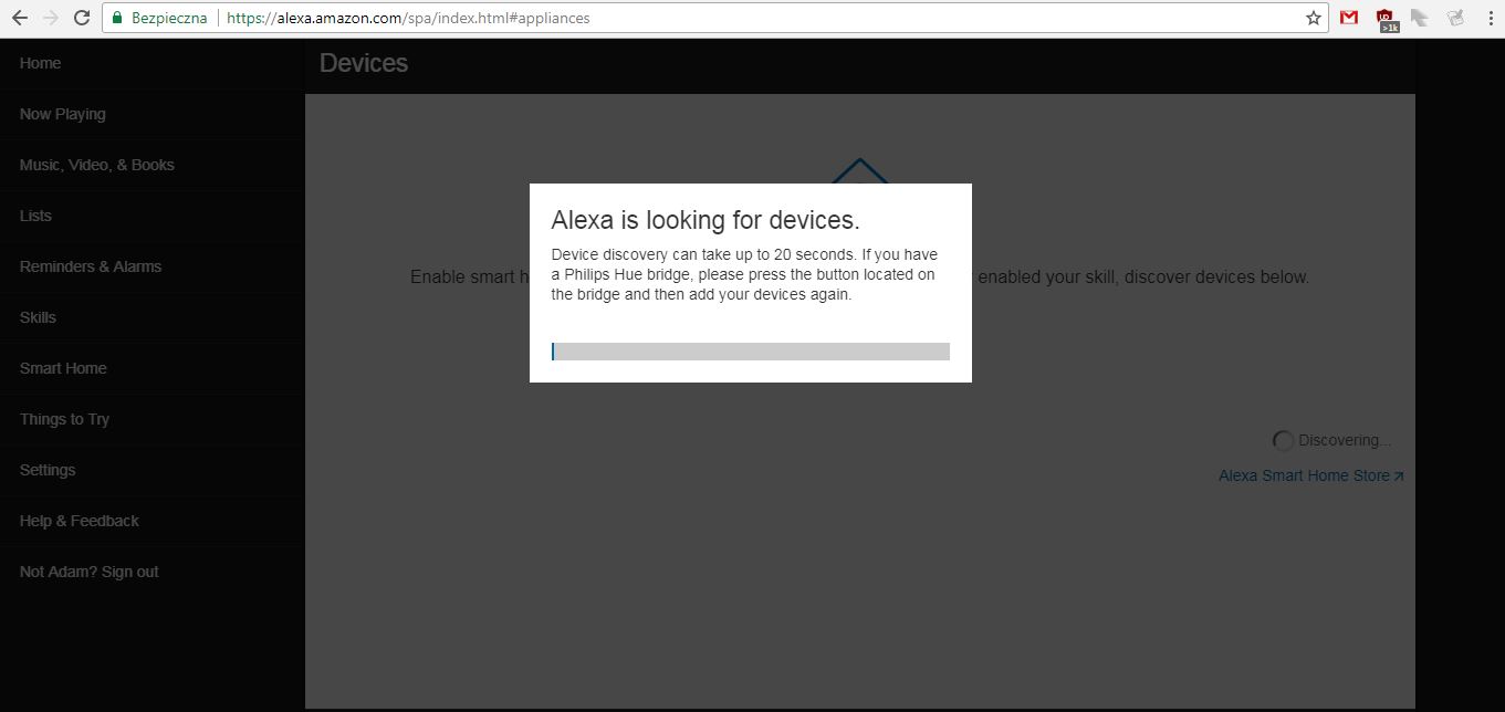 Chwilowo tyle. Przechodzimy do serwisu Alexa albo wydajemy jej polecenie 'Alexa, discover devices’. Dla jasności przestawiam również proces rozpoznawania na stronie, który ogranicza się do wybrania Discover.