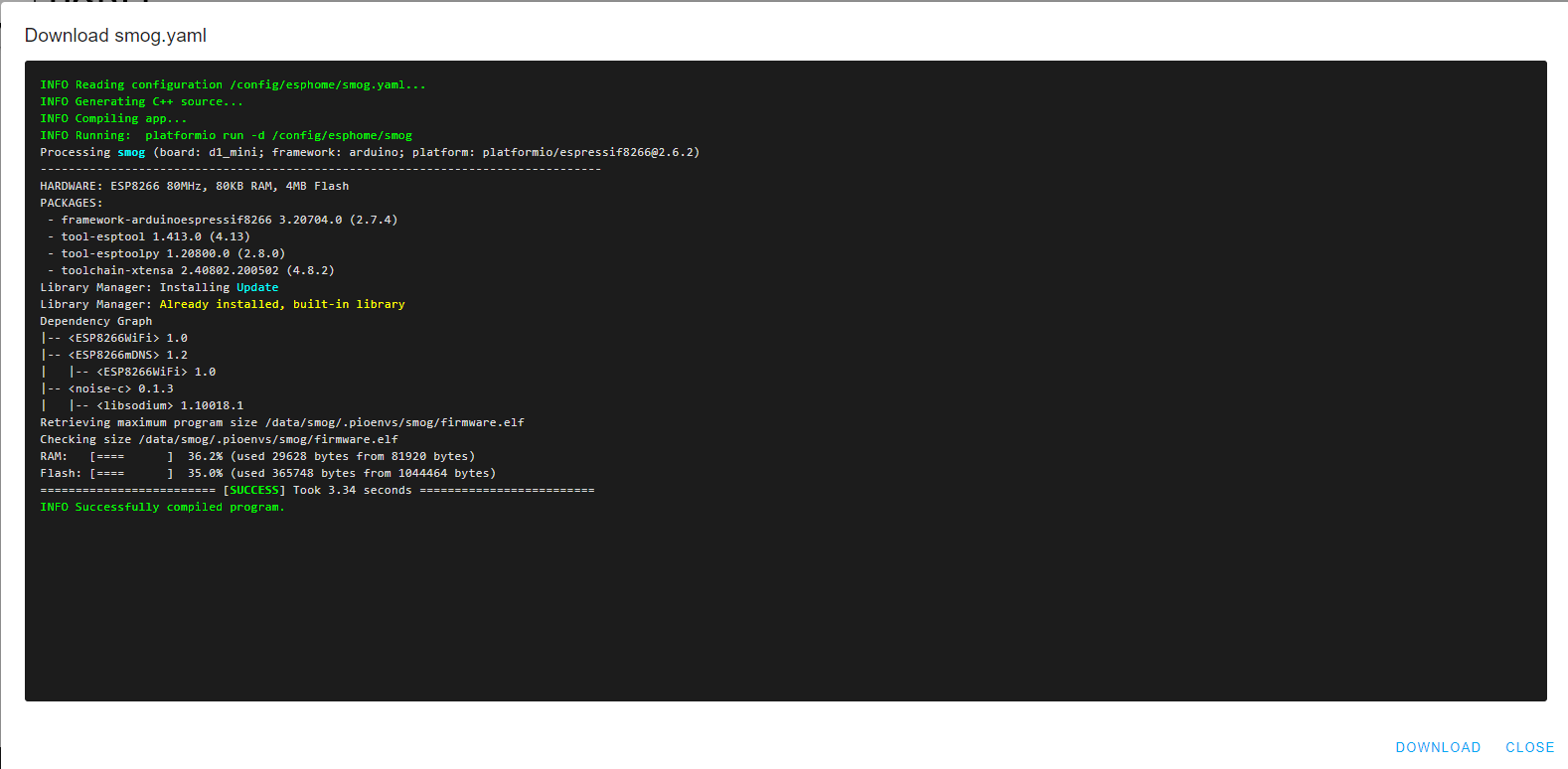 W tx_pin i rx_pin podajecie swoje porty w ESP8266, nazwę jaka Wam się podoba i update_interval. Ostatni parametr jest domyślnie ustawiony na zero (0), co oznacza ciągłą pracę. Jeżeli nie podłączycie nic pod rx_pin to czujnik nie dostanie informacji o zmianie i tak właśnie zostanie zainicjowany. Jednak nie jest to najlepsze podejście, bo raz, że zużywa laser, dwa – tak ciągłe odczyty nie są potrzebne. Ja ustawiłem na 30 minut, przed upływem tego czasu wiatraczek w czujniku włączy się 30 sekund aby się rozgrzać, zrobi pomiar i wyłączy się na kolejne 30 minut. Bajka.