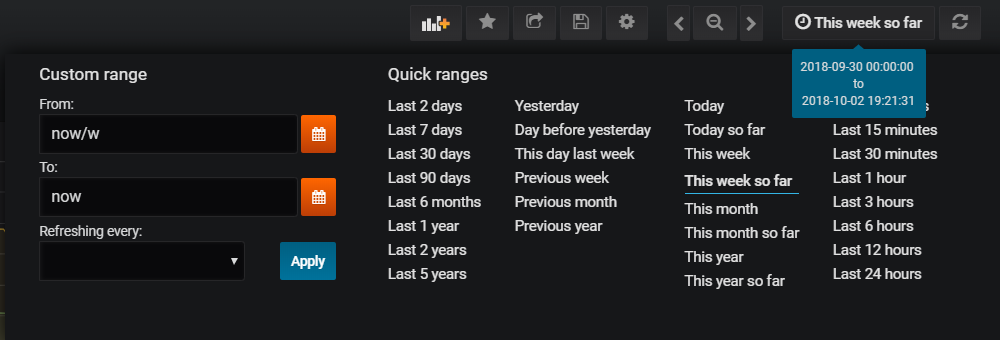 Kolejna funkcjonalność – w prawym górnym rogu widzicie ikonę zegara. To tam można zmienić zakres pokazywanych danych. A wybór jest duży, bo oprócz własnego zakresu, są między innymi: