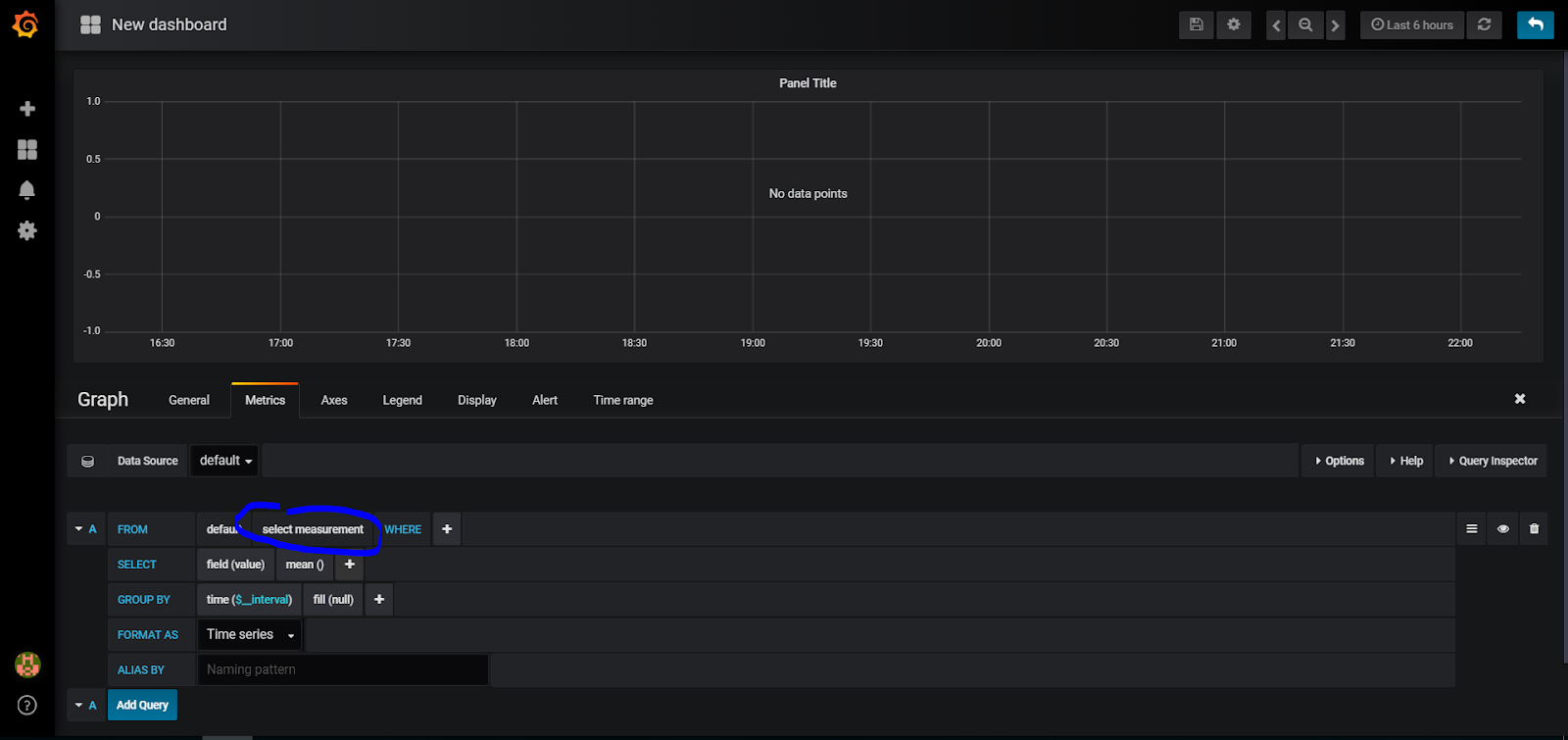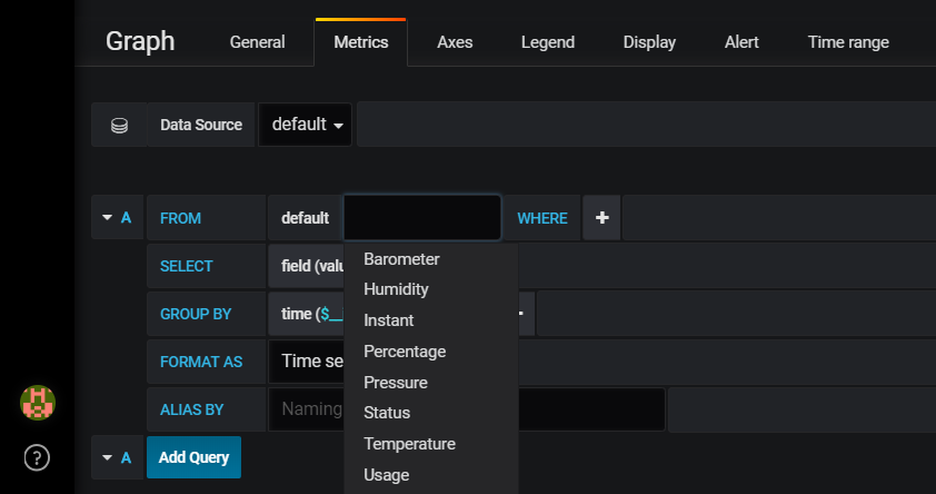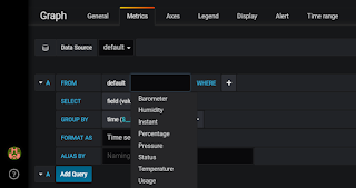Aby sobie zbyt życia nie komplikować na początku, wybieramy 'select measurement’. Zawartość tego pola jest oczywiście zależna od miar (czyli na przykład Ciśnienia, Temperatury, Wilgotności) jakie przesyłacie do InfluxDB z Domoticz.