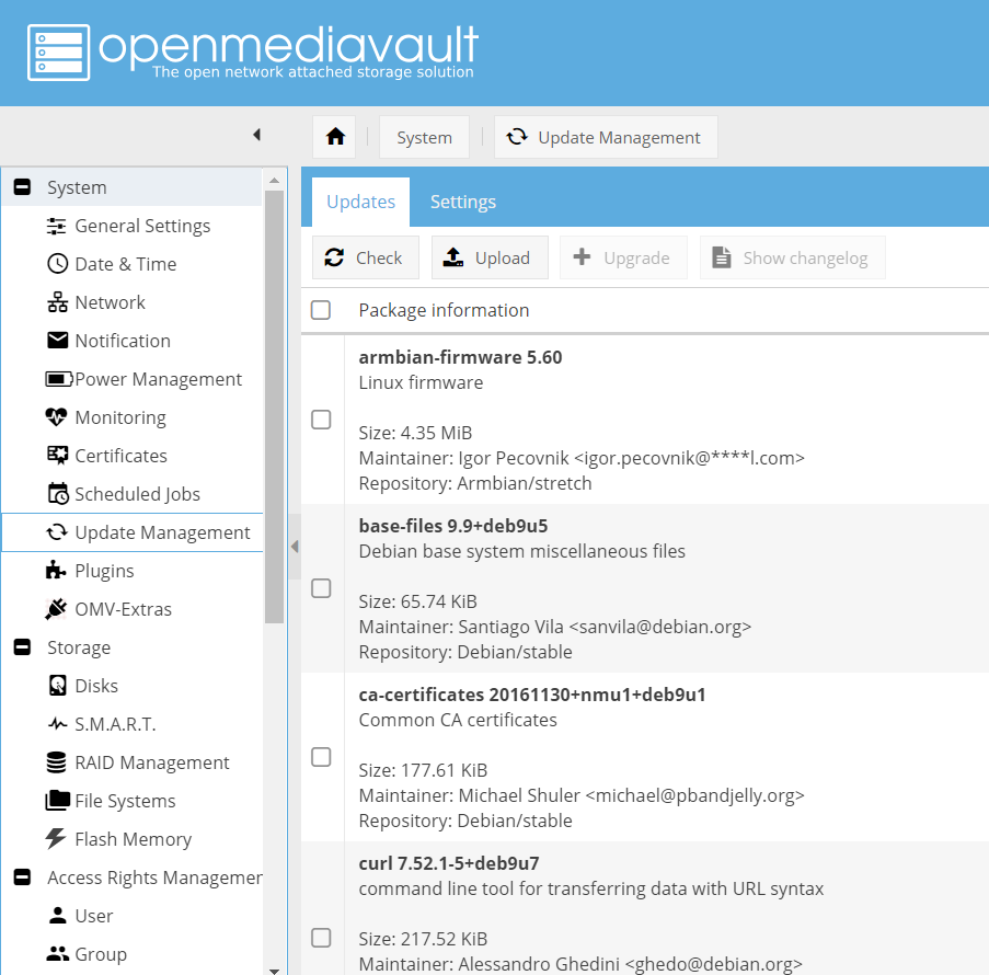 – shellinabox – możliwość zalogowania SSH bezpośrednio przez stronę OMV