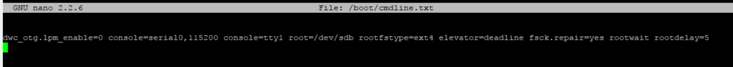 dwc_otg.lpm_enable=0 console=serial0,115200 console=tty1 root=/dev/sdb rootfstype=ext4 elevator=deadline fsck.repair=yes rootwait rootdelay=5